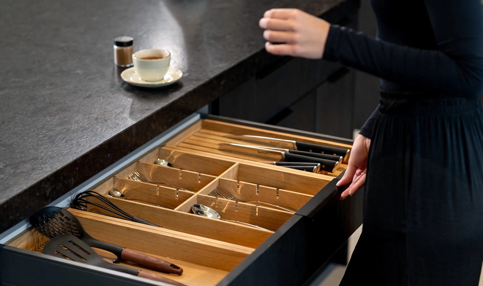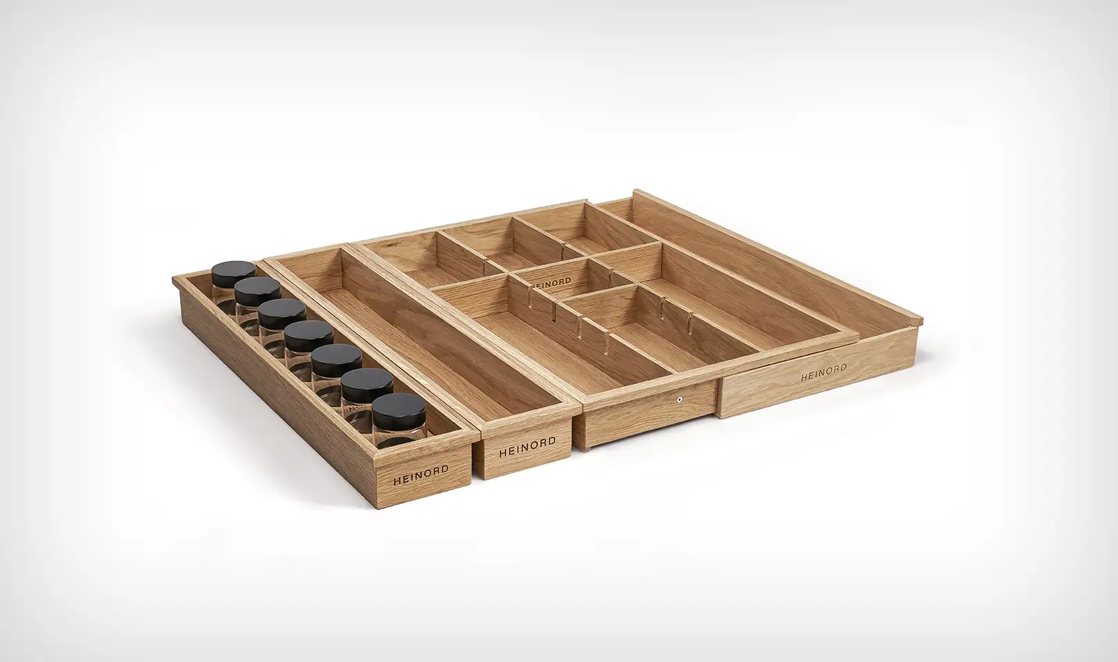 Jest wiele organizerów do szuflad kuchennych, ale naturalne, lite, dębowe drewno jest unikalnym materiałem w tym segmencie.
