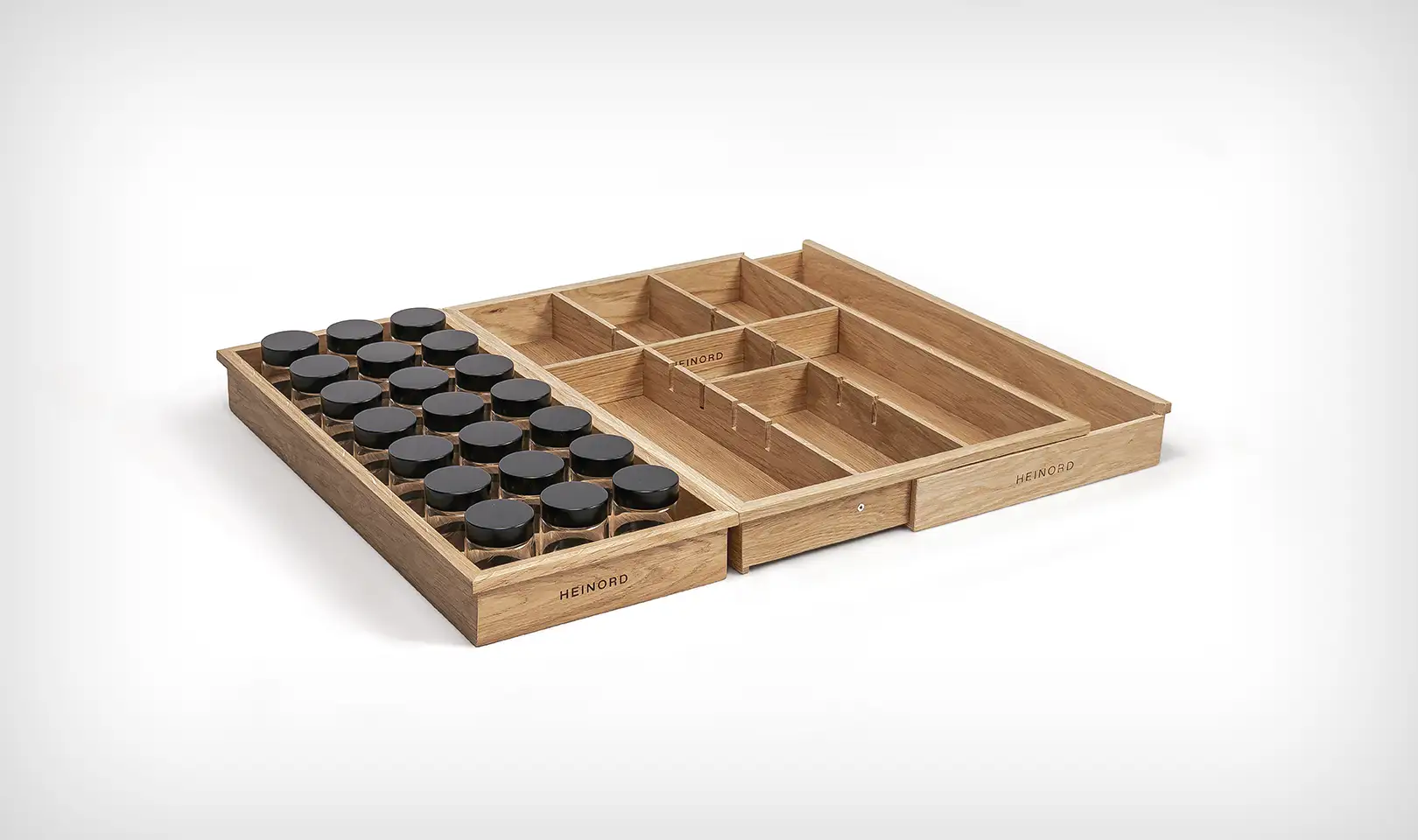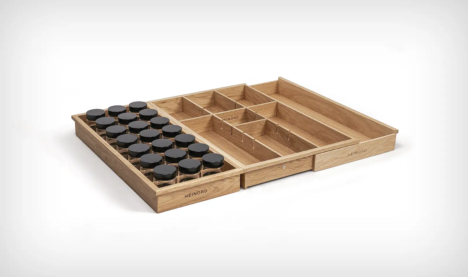 Jest wiele organizerów do szuflad kuchennych, ale naturalne, lite, dębowe drewno jest unikalnym materiałem w tym segmencie.