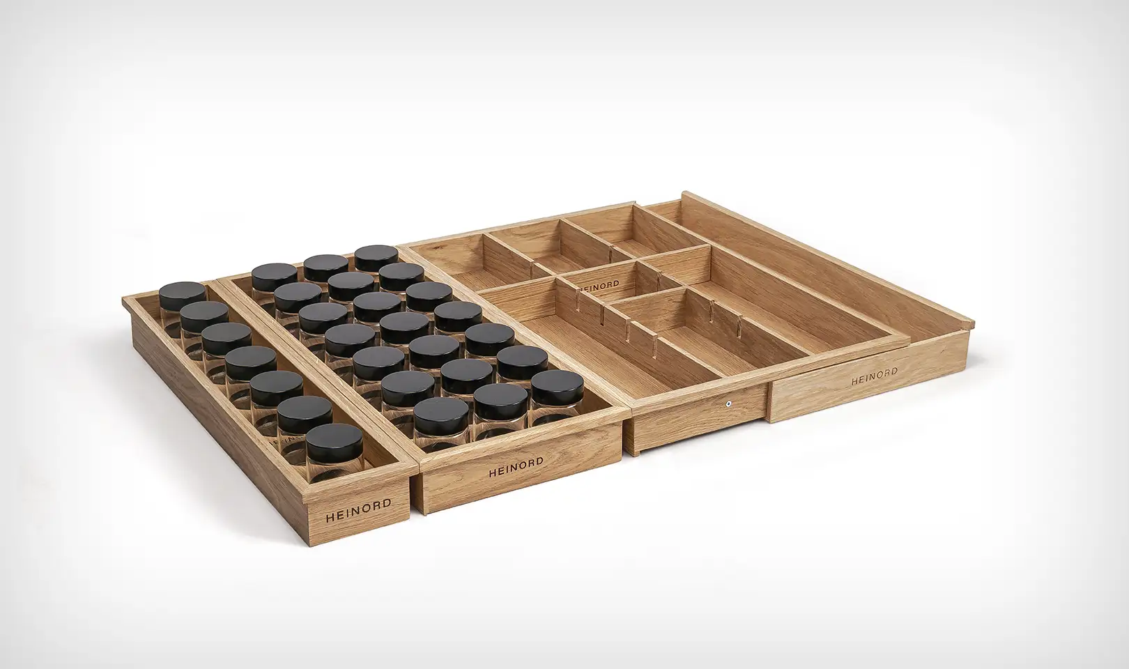 Jest wiele organizerów do szuflad kuchennych, ale naturalne, lite, dębowe drewno jest unikalnym materiałem w tym segmencie.