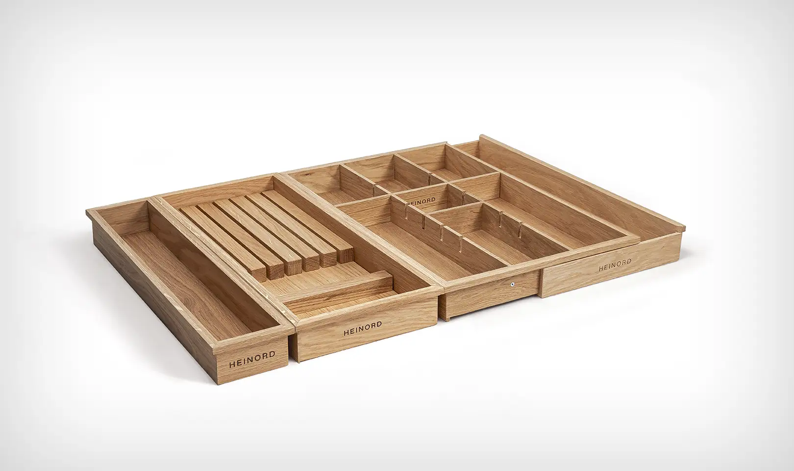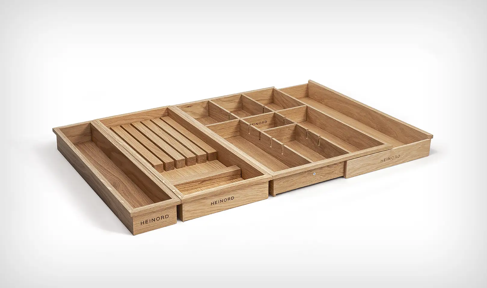 Jest wiele organizerów do szuflad kuchennych, ale naturalne, lite, dębowe drewno jest unikalnym materiałem w tym segmencie.